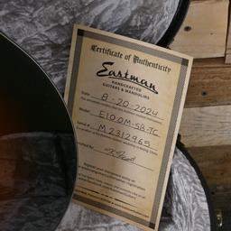 The Eastman Thermo Cure Series E10OM-TC-SB OM Sunburst is a beautifully crafted acoustic guitar that combines traditional design with modern advancements. This orchestra model (OM) features a solid Thermo-Cured Adirondack Spruce top paired with solid mahogany back and sides, delivering a rich, warm tone with enhanced resonance. The guitar's meticulous craftsmanship is highlighted by its classic rosette, tortoise shell binding, and a stunning Truetone gloss finish. Perfect for fingerstyle players and strummers alike, the E10OM-TC-SB offers a versatile sound with excellent projection and clarity.