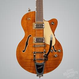 The Gretsch Electromatic® LTD Flame Okoume Broadkaster® Jr. Single-Cut with Bigsby® delivers the classic Gretsch tone and style that has defined rock and roll. This premium semi-hollowbody electric guitar is built for players seeking a blend of rich, resonant tone, effortless playability, and distinctive vintage-inspired aesthetics. Featuring a gorgeous flame okoume body, this instrument offers a wealth of high-end features that provide exquisite tone and style right out of the box. The stunning Roundup Orange Stain finish enhances its sleek aesthetic, ensuring the Gretsch Electromatic® LTD Flame Okoume Broadkaster® Jr. Single-Cut with Bigsby® is a standout instrument.