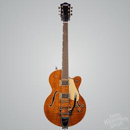 The Gretsch Electromatic® LTD Flame Okoume Broadkaster® Jr. Single-Cut with Bigsby® delivers the classic Gretsch tone and style that has defined rock and roll. This premium semi-hollowbody electric guitar is built for players seeking a blend of rich, resonant tone, effortless playability, and distinctive vintage-inspired aesthetics. Featuring a gorgeous flame okoume body, this instrument offers a wealth of high-end features that provide exquisite tone and style right out of the box. The stunning Roundup Orange Stain finish enhances its sleek aesthetic, ensuring the Gretsch Electromatic® LTD Flame Okoume Broadkaster® Jr. Single-Cut with Bigsby® is a standout instrument.